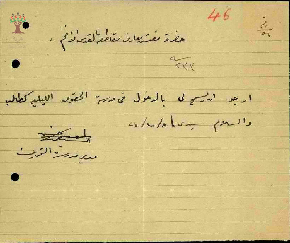 رسالة من المعلم طلعت السيفي الى مفتش المعارف يطلب السماح له بالدخول الى مدرسة الحقوق الليلية كطالب
