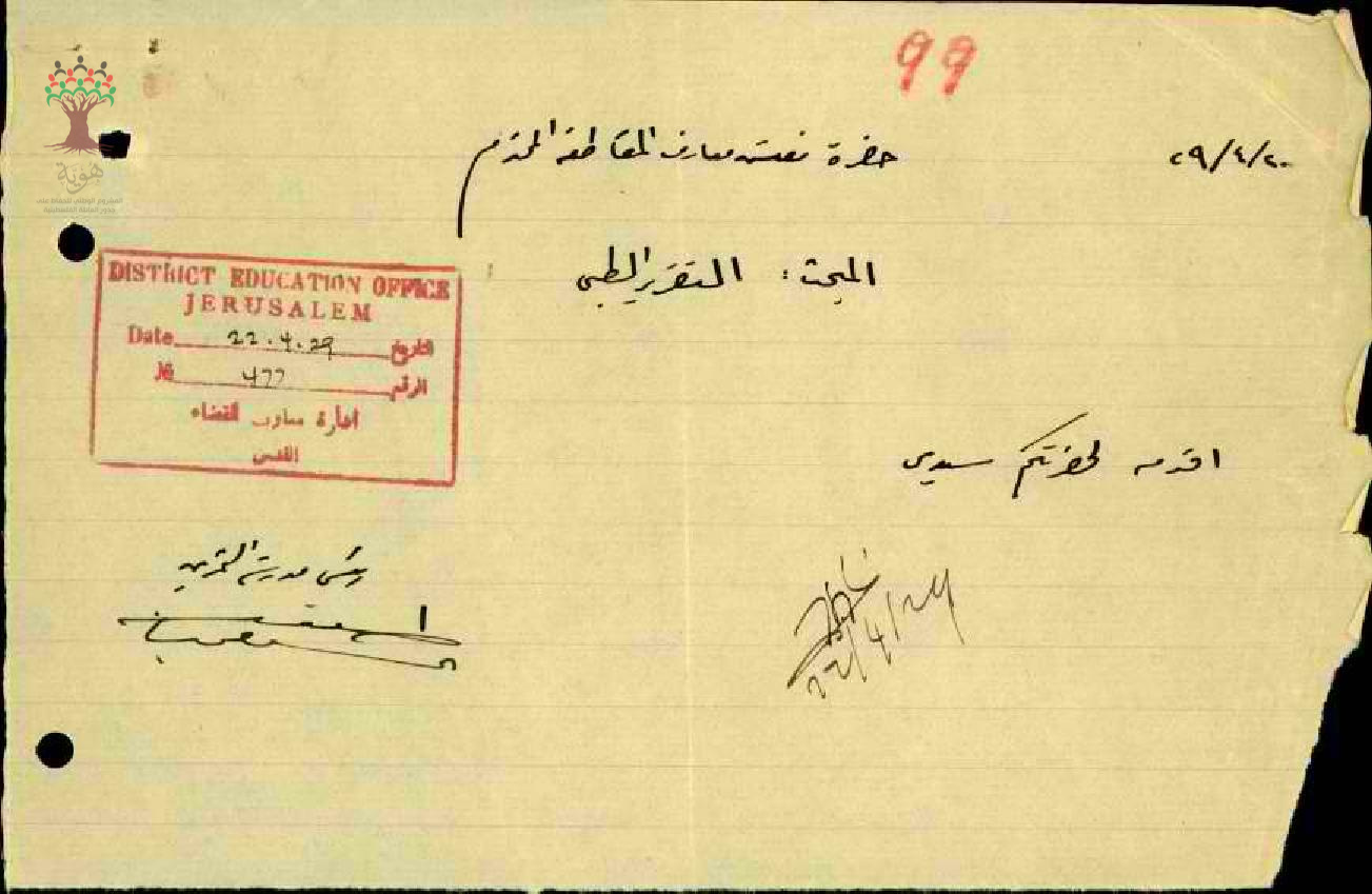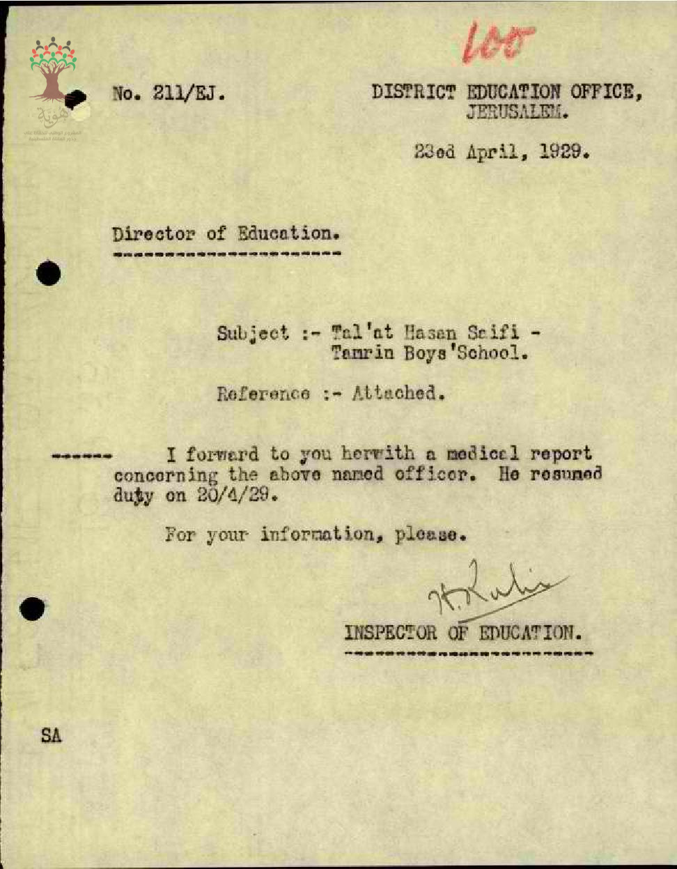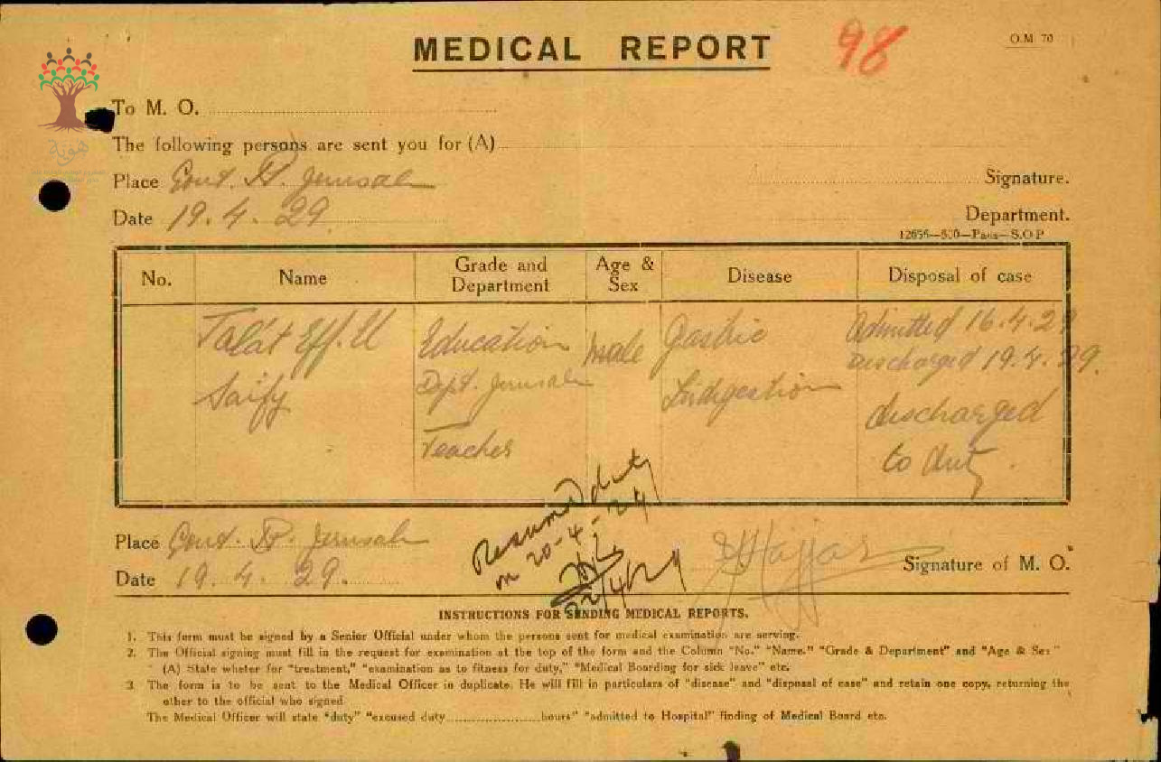 رسالة من مفتش المعارف الى مدير المعارف بخصوص تغيب المعلم طلعت السيفي مرفقة بالتقرير الطبي وعودته الى العمل
