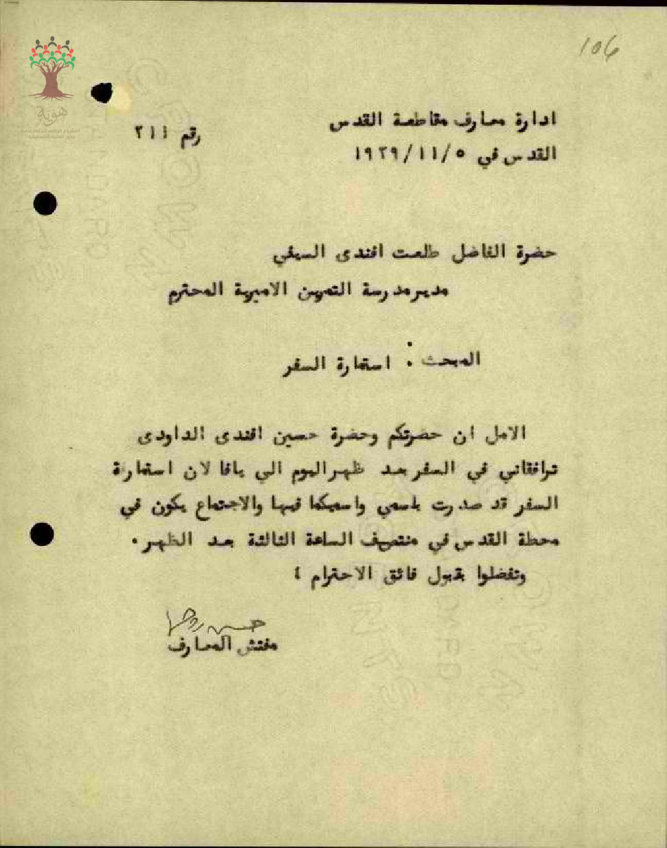 رسالة من مفتش المعارف الى المعلم طلعت السيفي بخصوص استمارة سفره