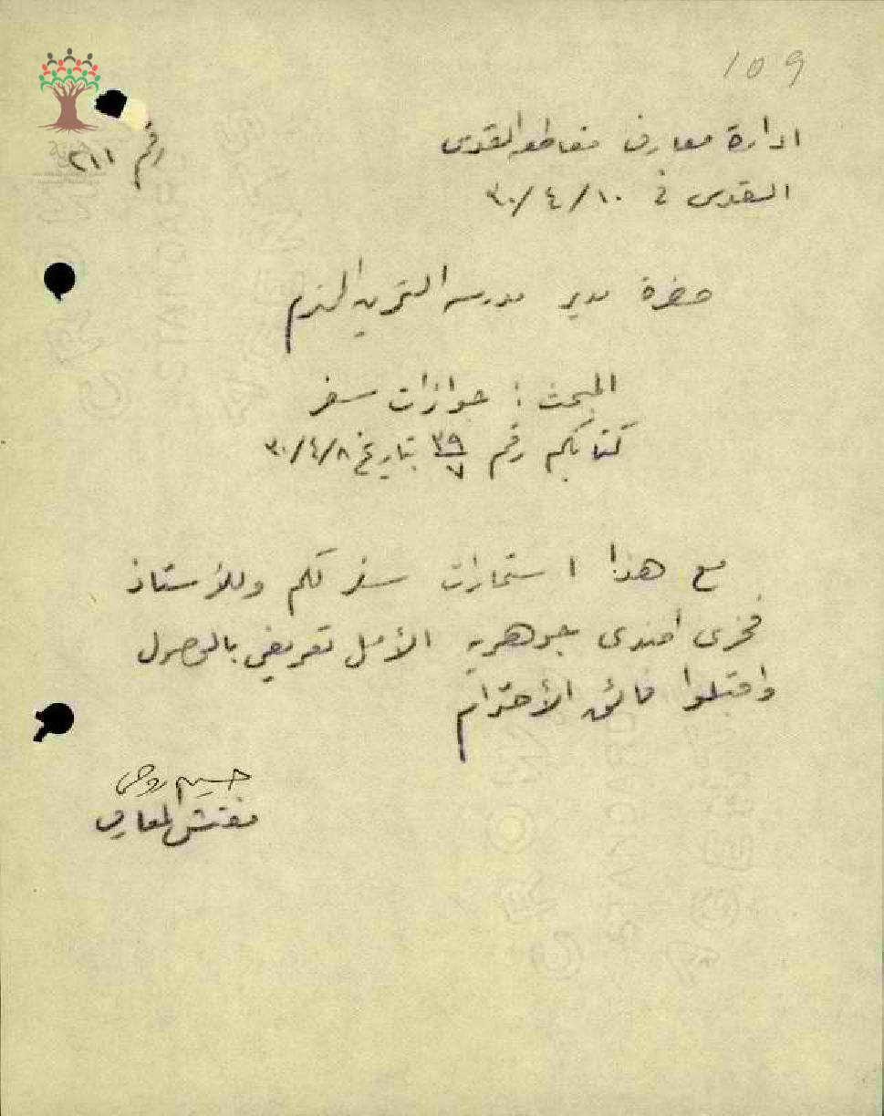 رسالة من مفتش المعارف الى المعلم طلعت السيفي بخصوص استمارة سفره السنوية