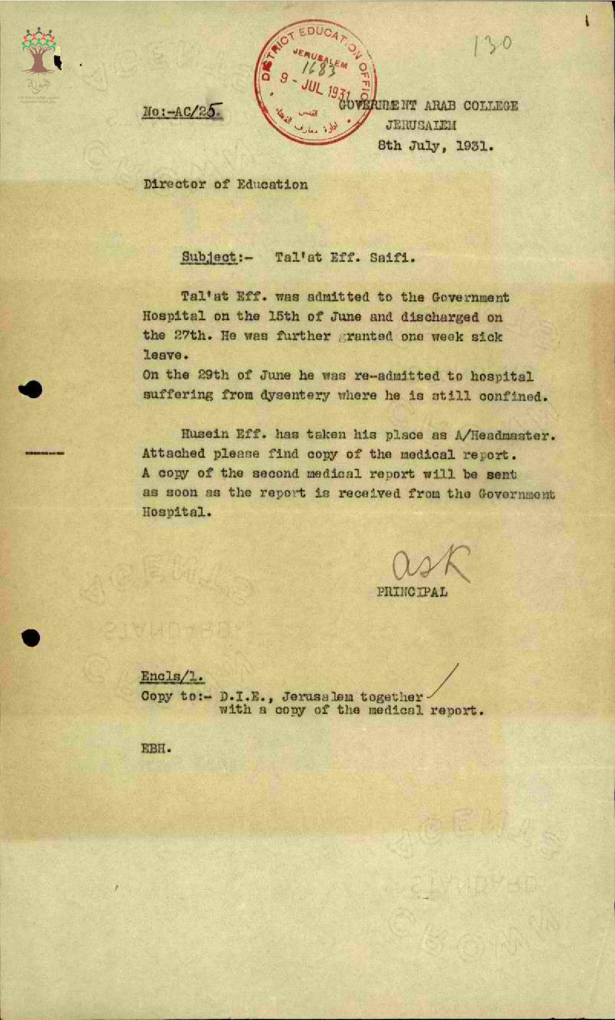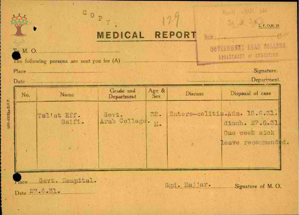 رسالة من مفتش المعارف الى مدير المعارف بخصوص اجازة مرضية للمعلم طلعت السيفي مدة أسبوع مرفقة بالتقرير الطبي