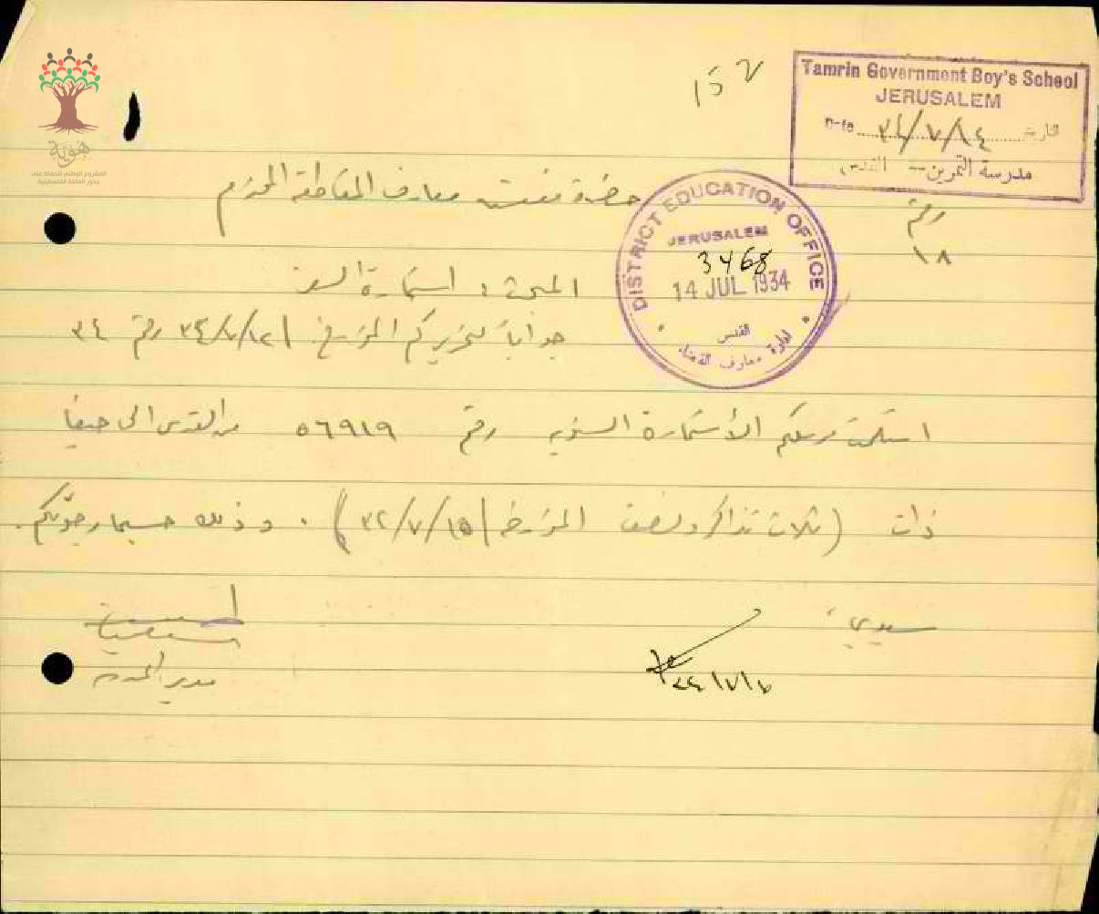 رسالة من المعلم طلعت السيفي الى مفتش المعارف يخبره بأنه قد استلم استمارة سفره
