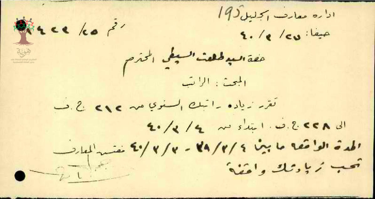 رسالة من مفتش المعارف الى المعلم طلعت السيفي بخصوص زيادة راتبه السنوية