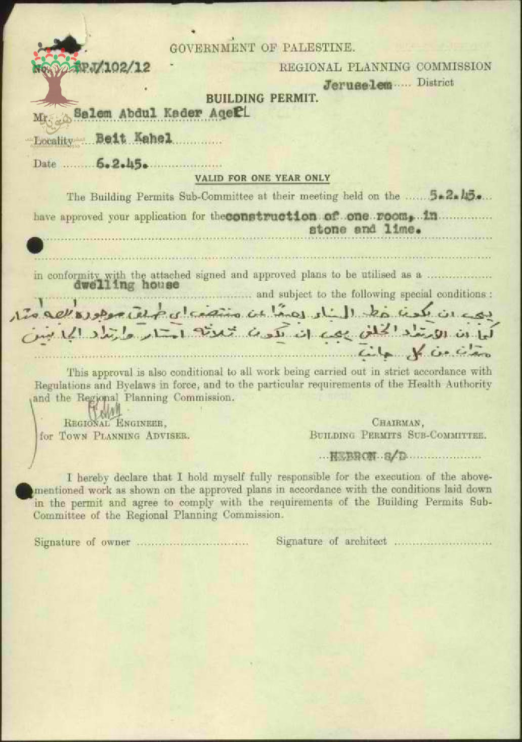 طلب رخصة بناء غرفة - سليم عبد القادر عقيل - بيت كاحل