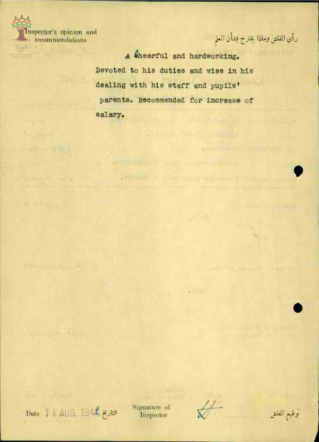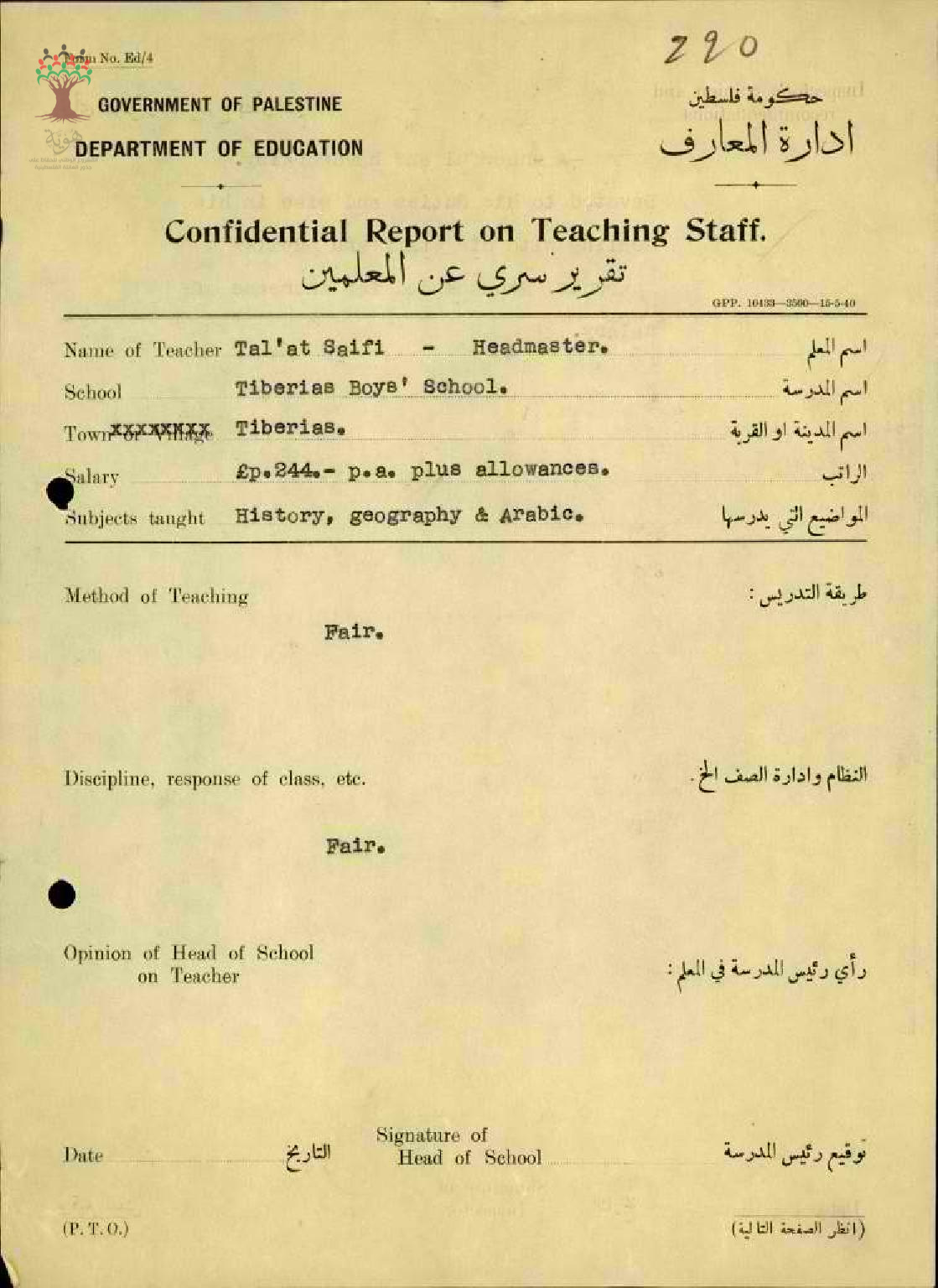 تقرير تفصيلي عن أداء المعلم طلعت السيفي في مدرسة ذكور طبريا سنة 1942