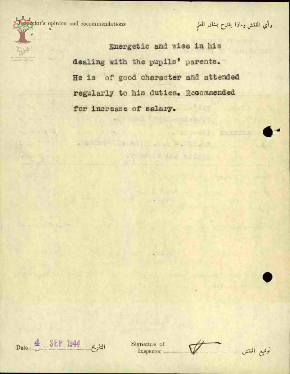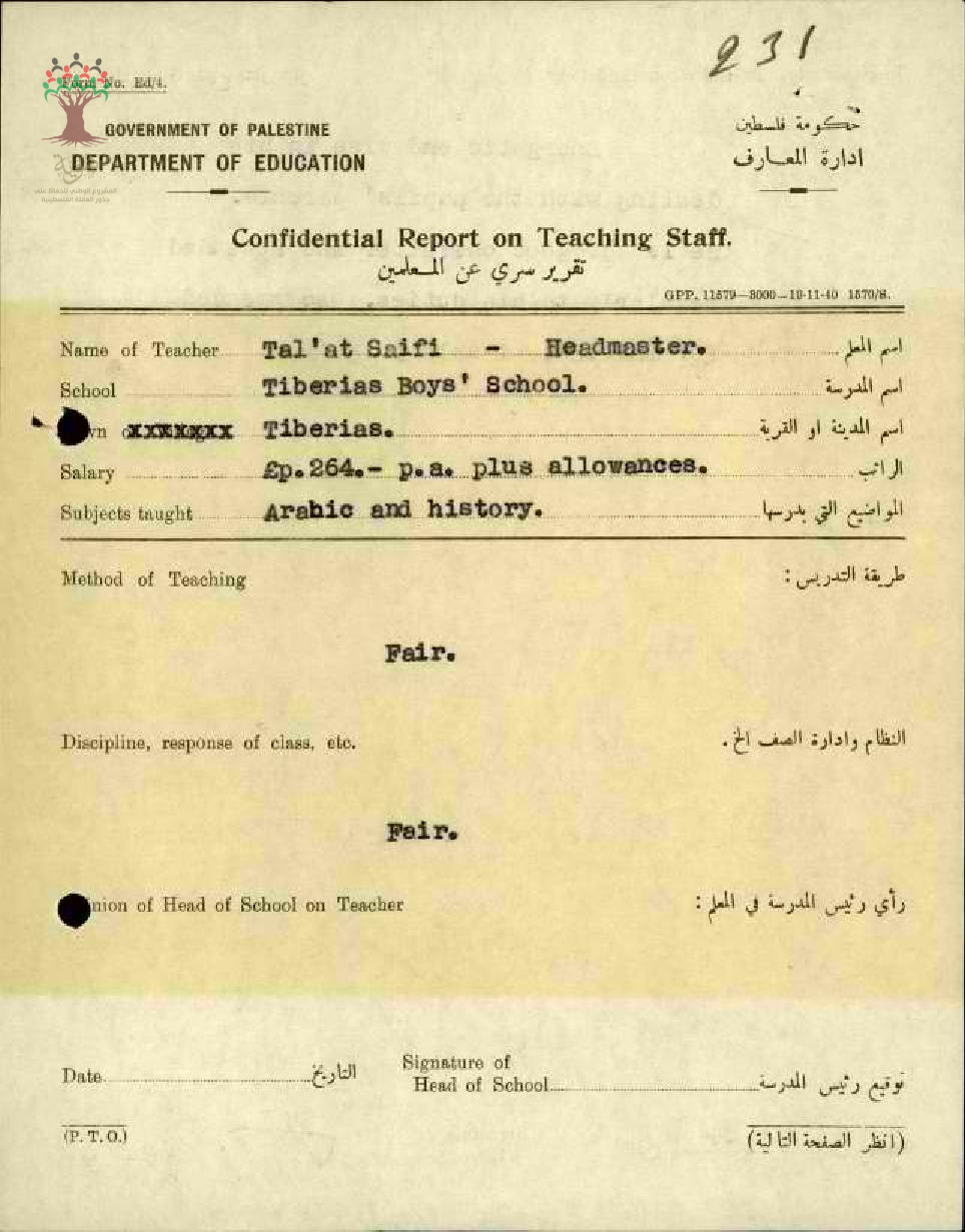 تقرير تفصيلي عن أداء المعلم طلعت السيفي في مدرسة ذكور طبريا سنة 1944