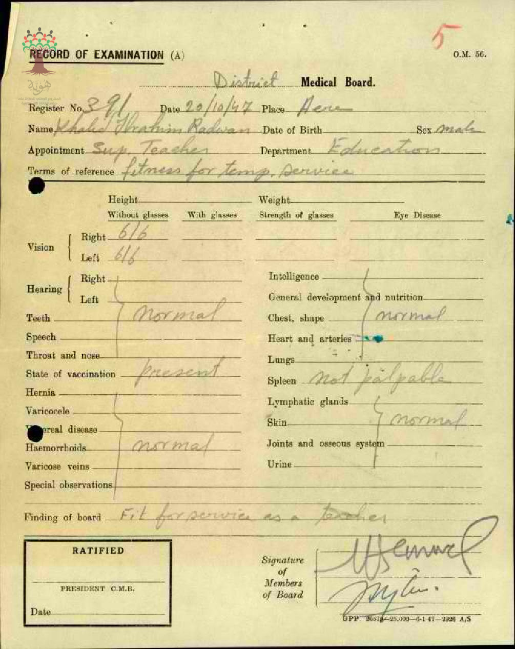 تقرير طبي لتعيين المعلم خالد رضوان في مدرسة طمرا