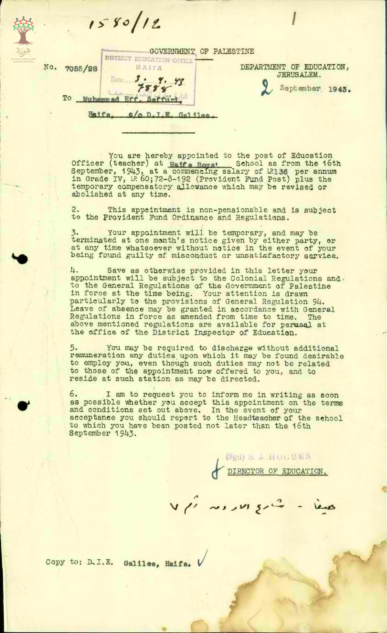 رسالة من مدير المعارف الى المعلم محمد حسن صفوري بخصوص شروط تعيينه