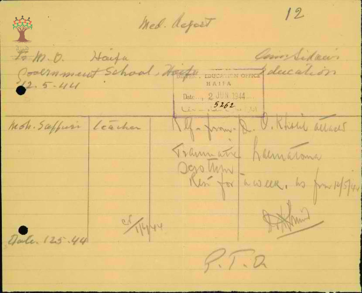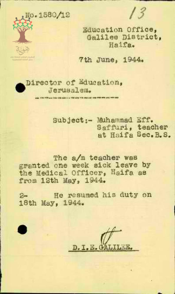 رسالة من مفتش المعارف الى مدير المعارف بخصوص اجازة مرضية للمعلم محمد صفوري مرفقة بالتقرير الطبي وعودته للعمل
