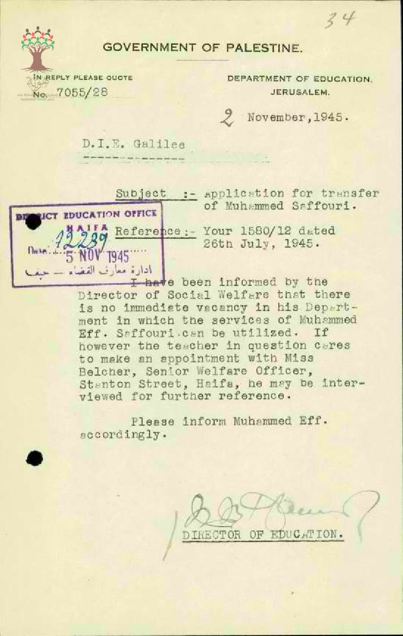 رسالة من مدير المعارف الى مفتش المعارف بخصوص عدم امكانية نقل المعلم محمد صفوري