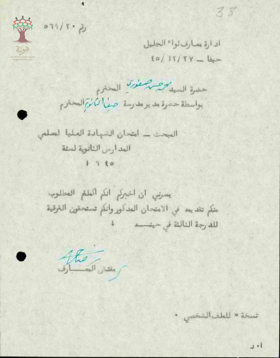 رسالة من مفتش المعارف الى المعلم محمد صفوري بخصوص اجتياز المعلم محمد صفوري لامتحان الشهادة العليا وترقيته