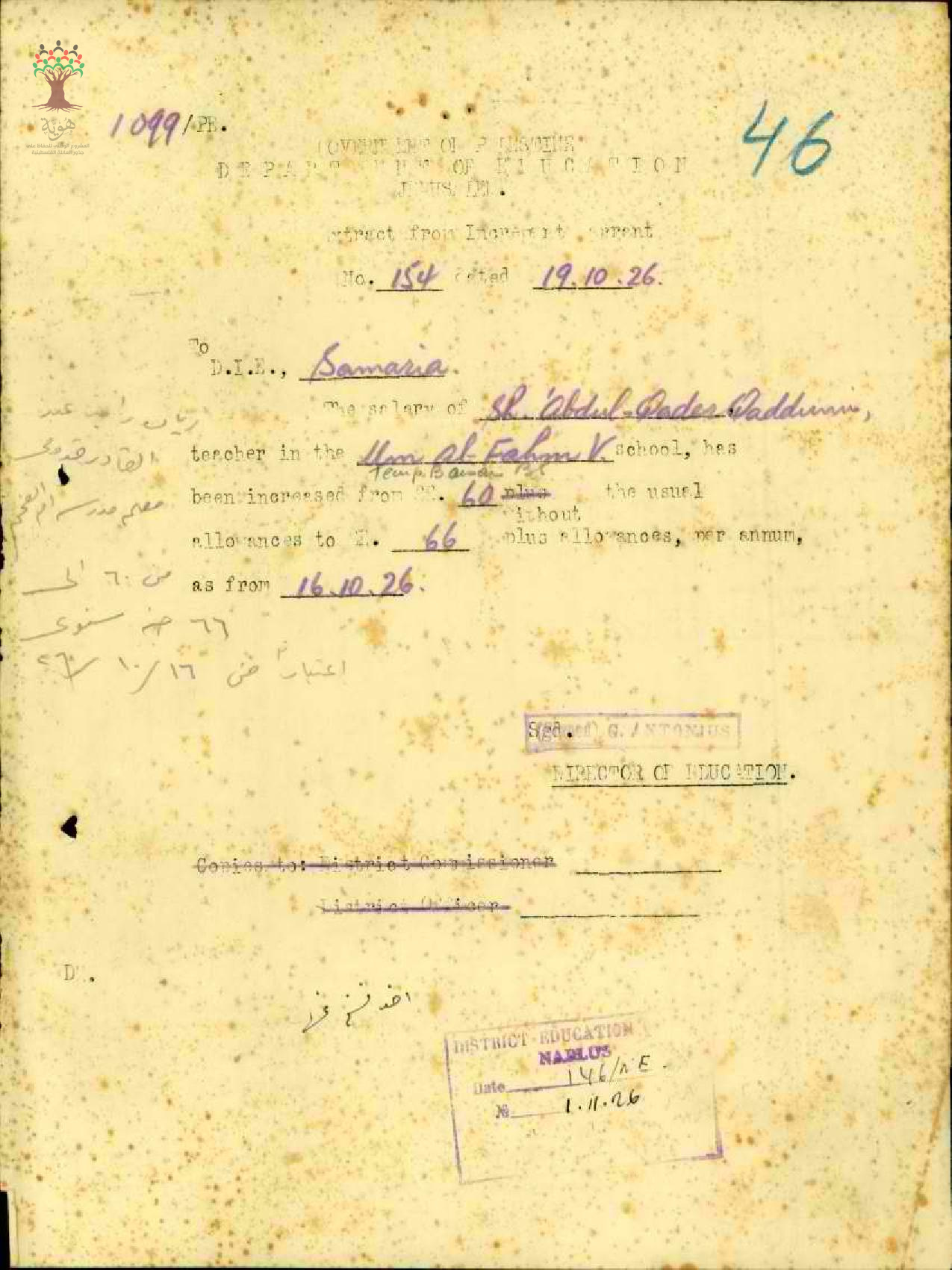 رسالة من مدير المعارف الى مفتش المعارف بخصوص زيادة راتب المعلم عبد القادر قدومي السنوية