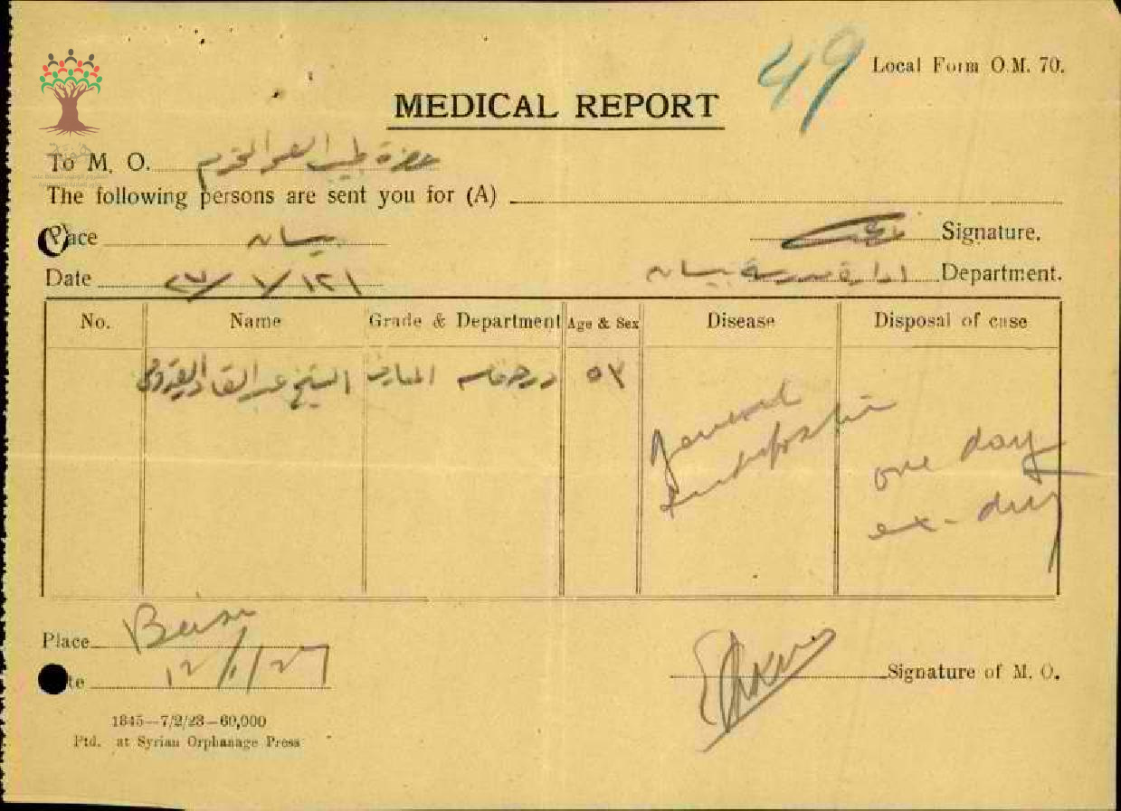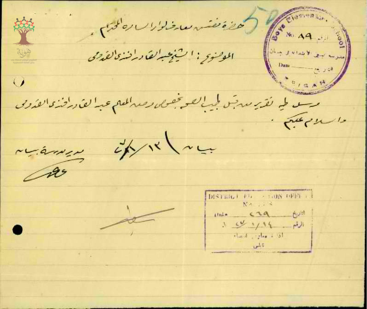 رسالة من مدير مدرسة بيسان الى مفتش المعارف بخصوص تغيب المعلم عبد القادر قدومي مرفقة بالتقرير الطبي