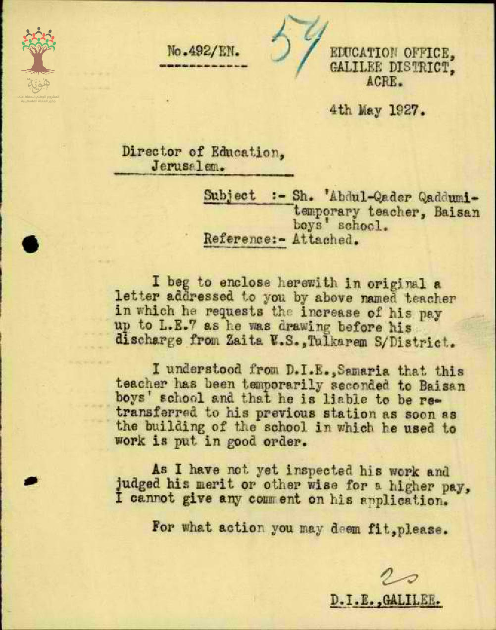 رسالة من مفتش المعارف الى مدير المعارف ينقل اليه طلب المعلم عبد القادر قدومي بزيادة رتبه