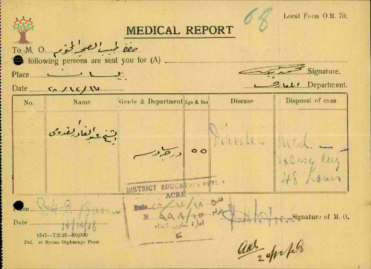 تقرير طبي عن غياب المعلم عبد القادر قدومي-مدرسة بيسان
