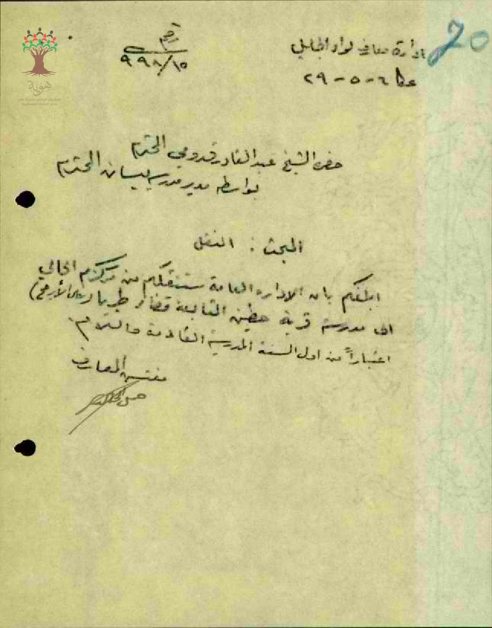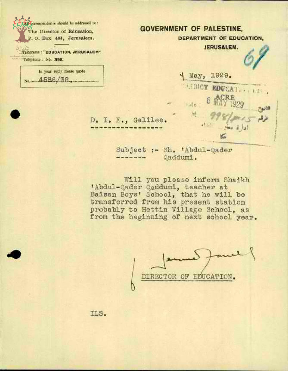 رسائل بخصوص نقل المعلم عبد القادر قدومي من مدرسة بيسان الى مدرسة حطين