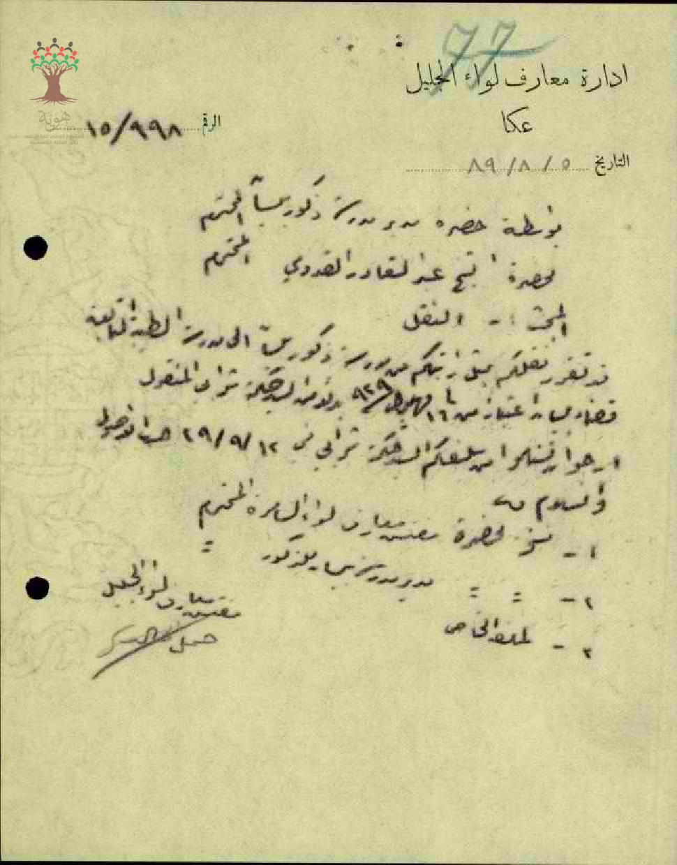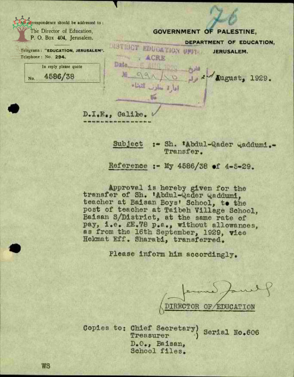 رسائل بخصوص نقل المعلم عبد القادر قدومي من مدرسة بيسان الى مدرسة الطيبة/قضاء بيسان