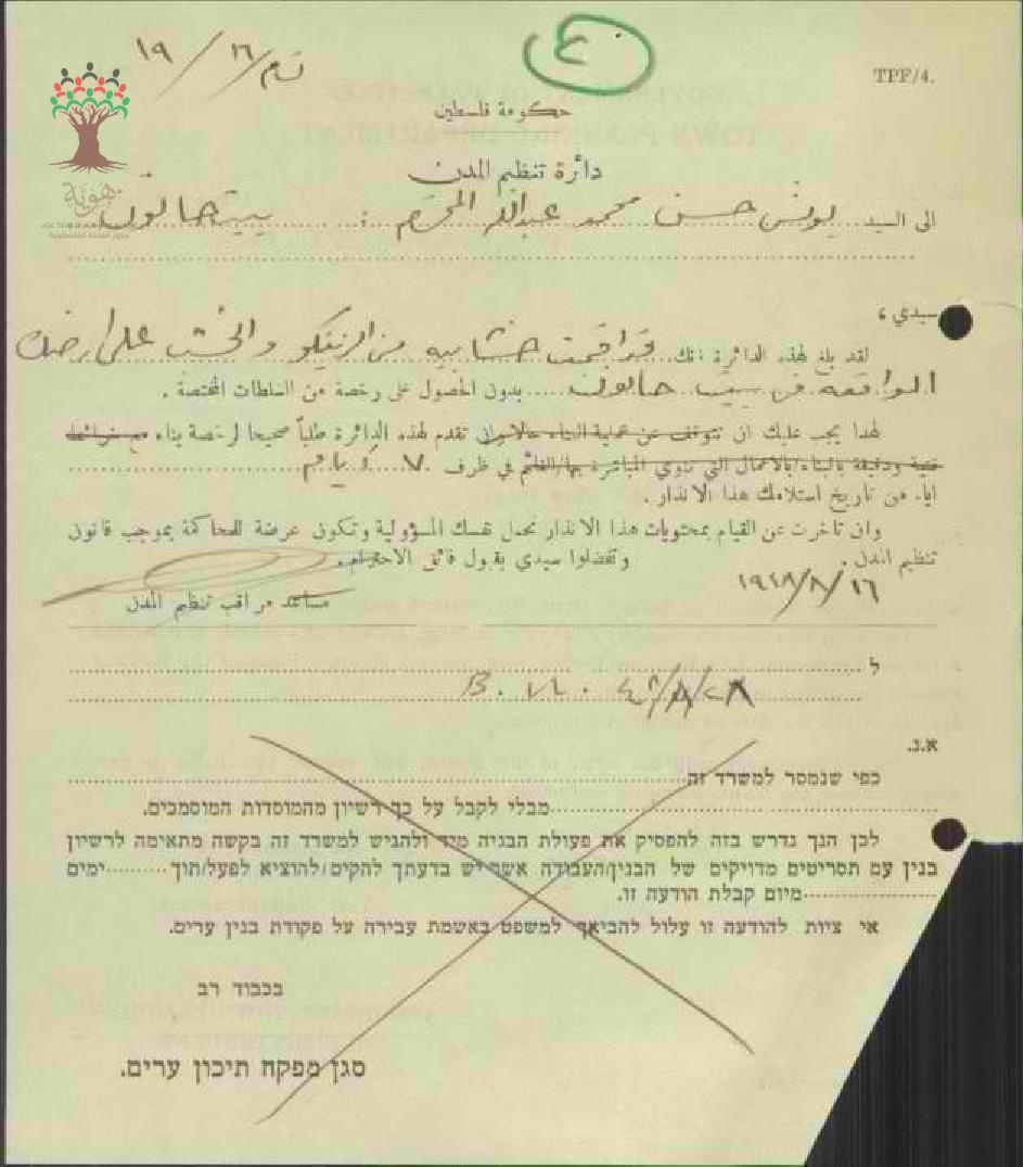 رسالة من دائرة تنظيم المدن للسيد يونس حسن محمد عبد الله بخصوص إقامة بناء بدون رخصة