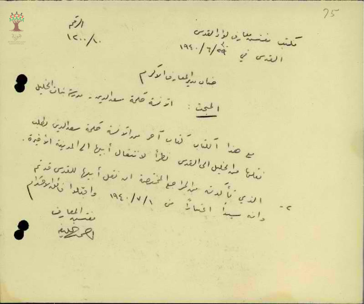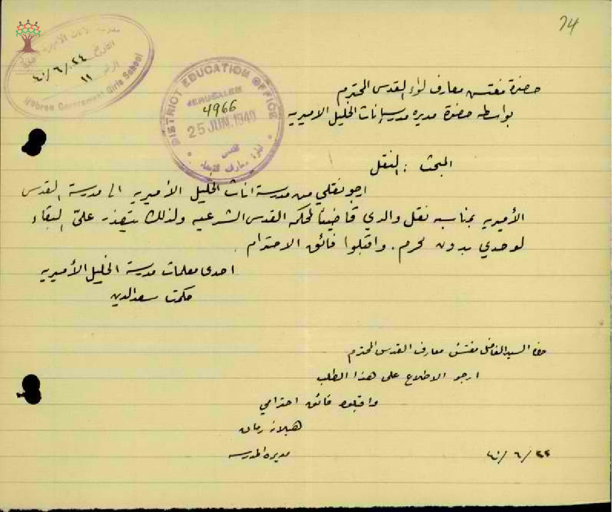 طلب نقل مقدم من المعلمة حكمت سعد الدين من مدرسة الخليل الى مدرسة القدس - صفد