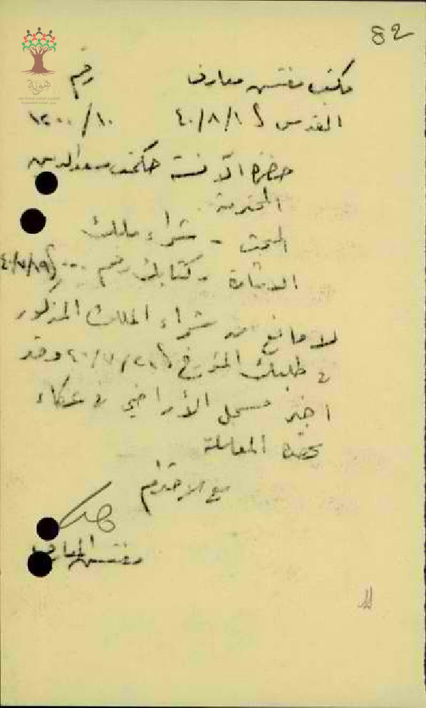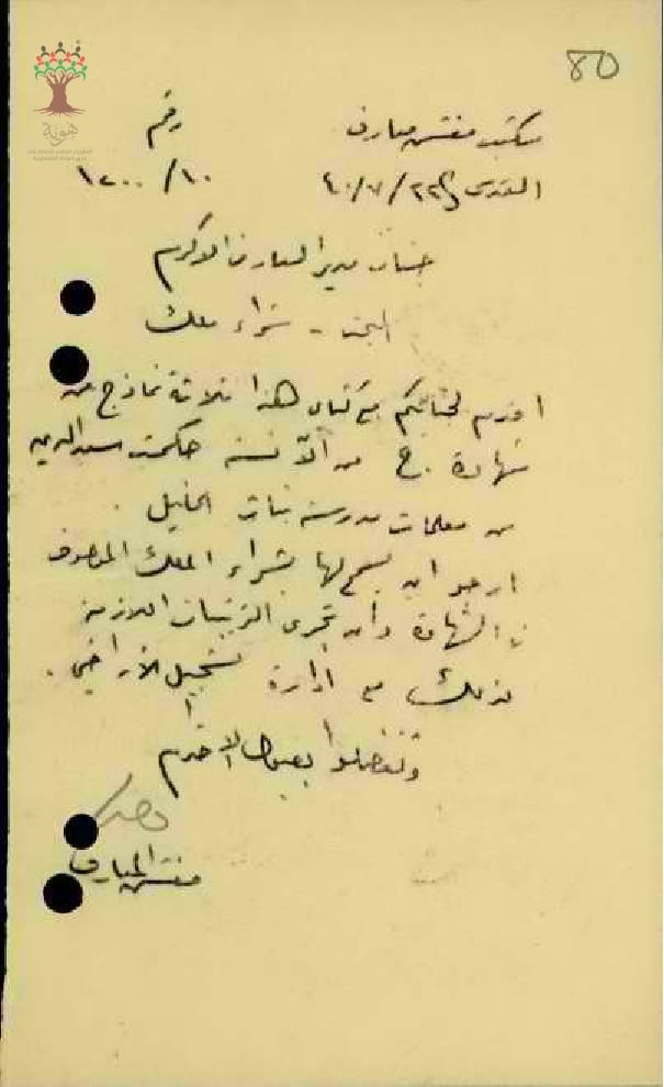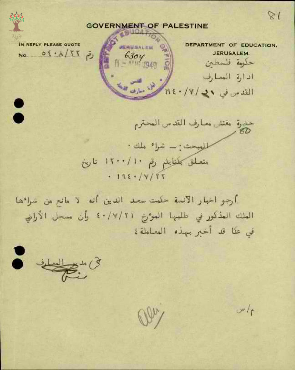 موافقة ادارة المعارف على تسجيل الارض للمعلمة حكمت سعد الدين - صفد - مدرسة الخليل