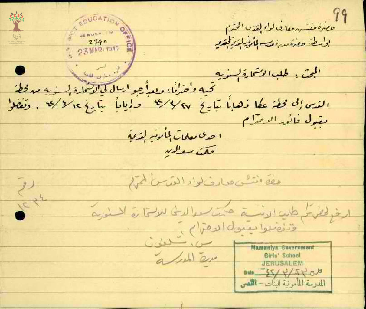 استمارة سفر من القدس الى عكا مقدمة من قبل المعلمة حكمت سعد الدين - صفد - مدرسة صفد