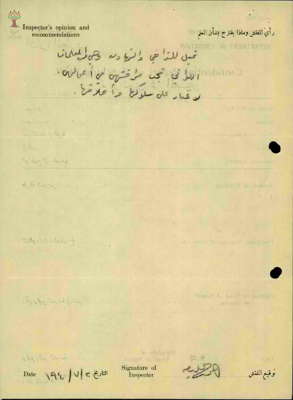 رأي المفتش العام المعلمة حكمت سعد الدين - صفد - مدرسة الخليل