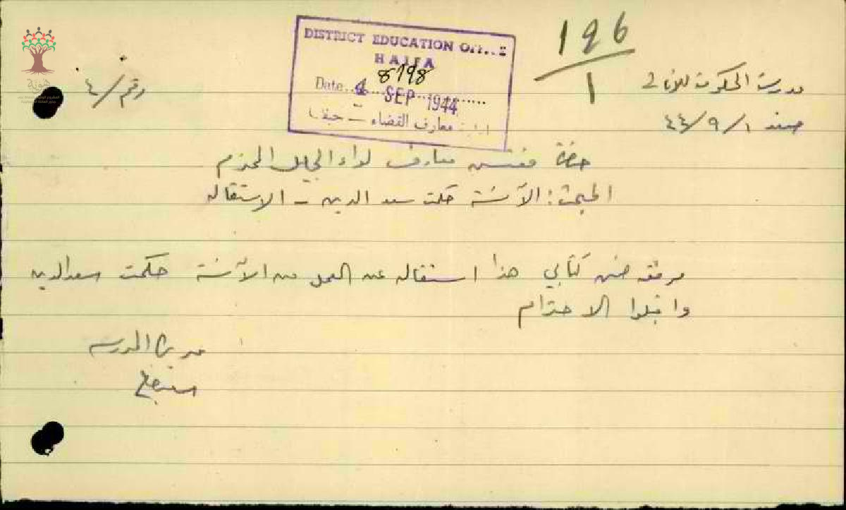 مراسلة مدير مدرسة صفد المفتش بخصوص استقالة المعلمة حكمت سعد الدين - صفد