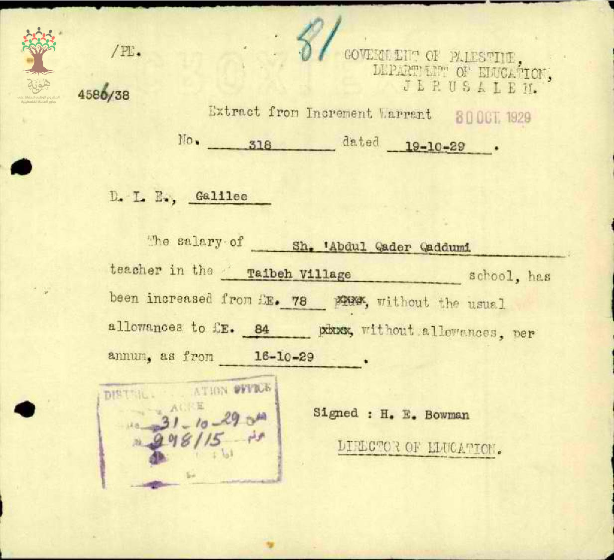 رسالة من مدير المعارف الى مفتش المعارف بخصوص زيادة راتب المعلم عبد القادر قدومي السنوية
