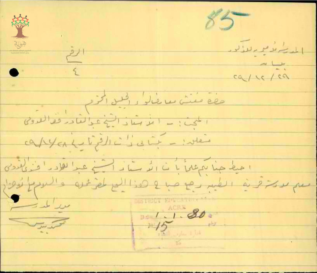 رسالة من مدير مدرسة بيسان الى مفتش المعارف بخصوص عودة المعلم عبد القادر قدومي الى العمل