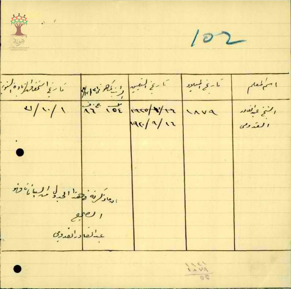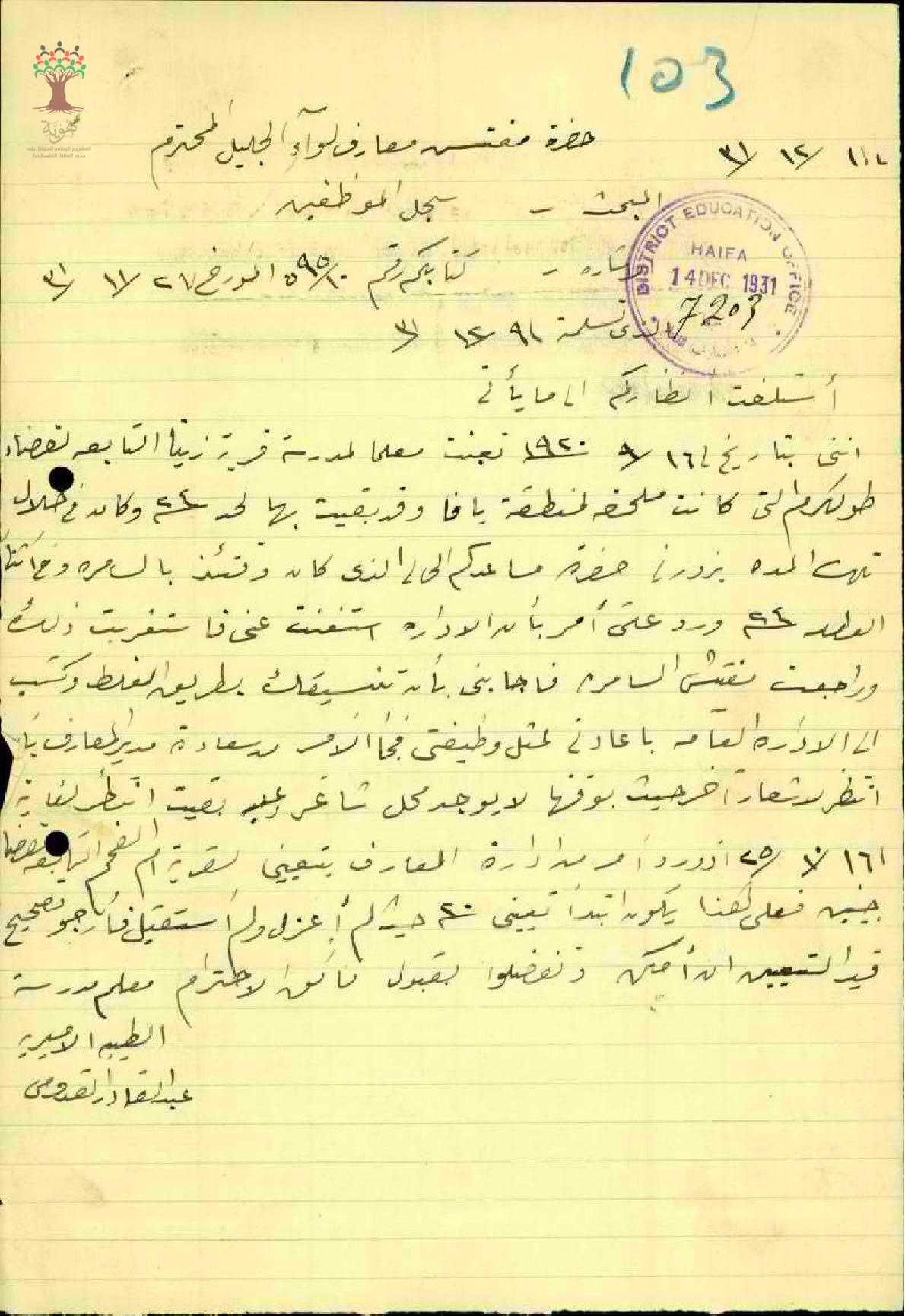 رسالة من المعلم عبد القادر قدومي الى مفتش المعارف بخصوص خطأ في سجلّ تعيينه لدى الادارة