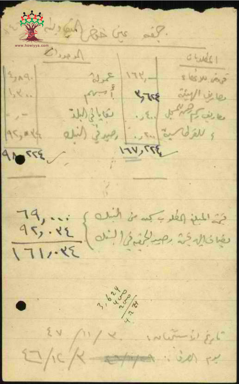 جمعية عين حوض - وثيقة تظهر المطلوبات والموجودات وقيمة المبلغ المطلوب سحبه من البنك وقيمة رصيد الجمعية في البنك