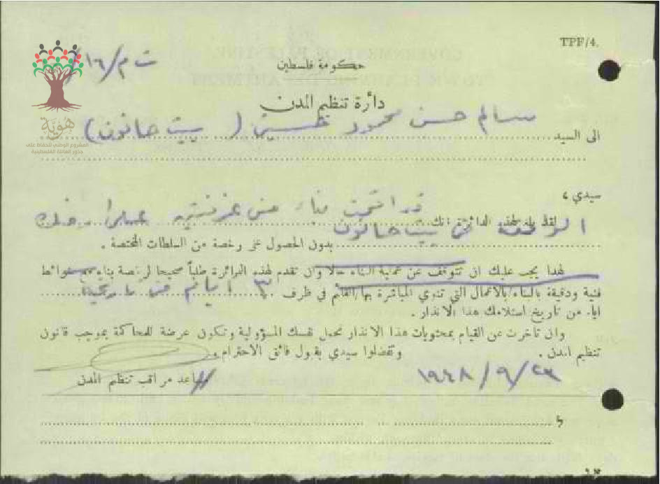 رسالة من دائرة تنظيم المدن للسيد سالم حسن محمود حسين بخصوص إقامة بناء بدون رخصة