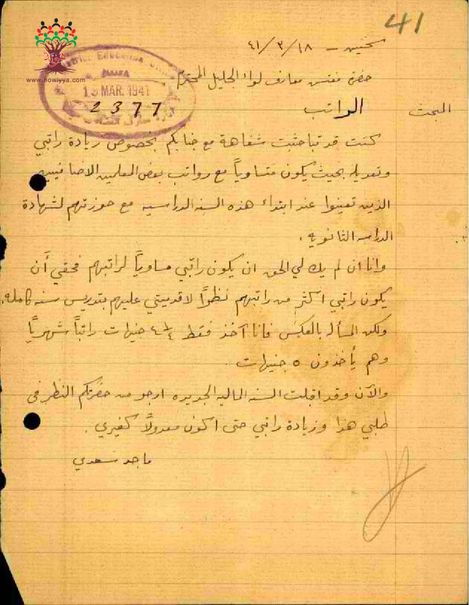 طلب زيادة مرتب مقدم من قبل المعلم المعلم ماجد السعدي - عكا - مدرسة سخنين