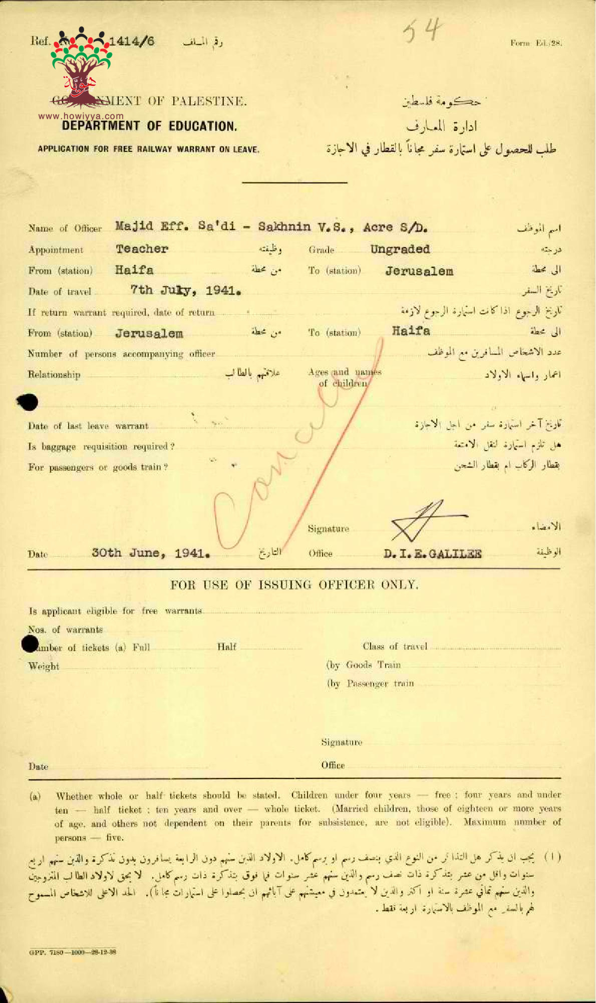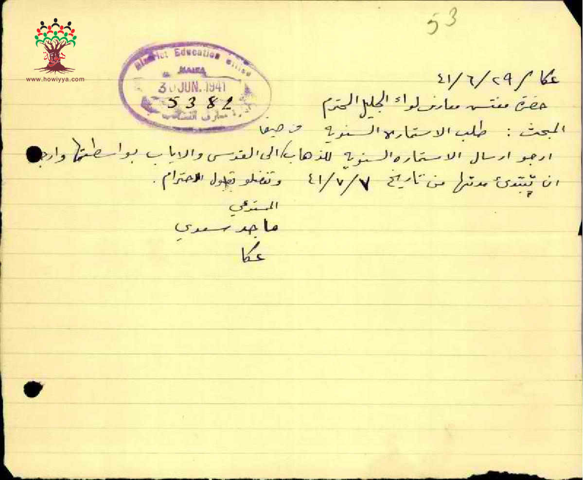 استمارة سفر من حيفا الى القدس مقدمة من قبل المعلم ماجد السعدي - مدرسة سخنين - عكا