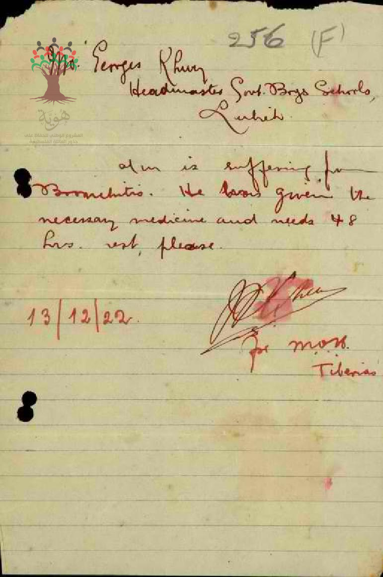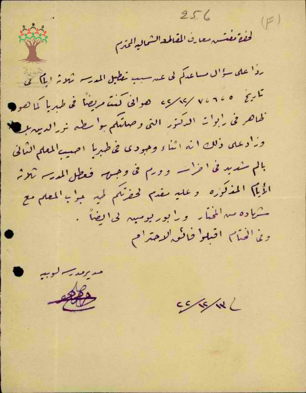 رسالة من مدير مدرسة لوبية الى مفتش المعارف بخصوص تغيب المعلم مصطفى عنبتاوي مرفقة بالتقرير الطبي