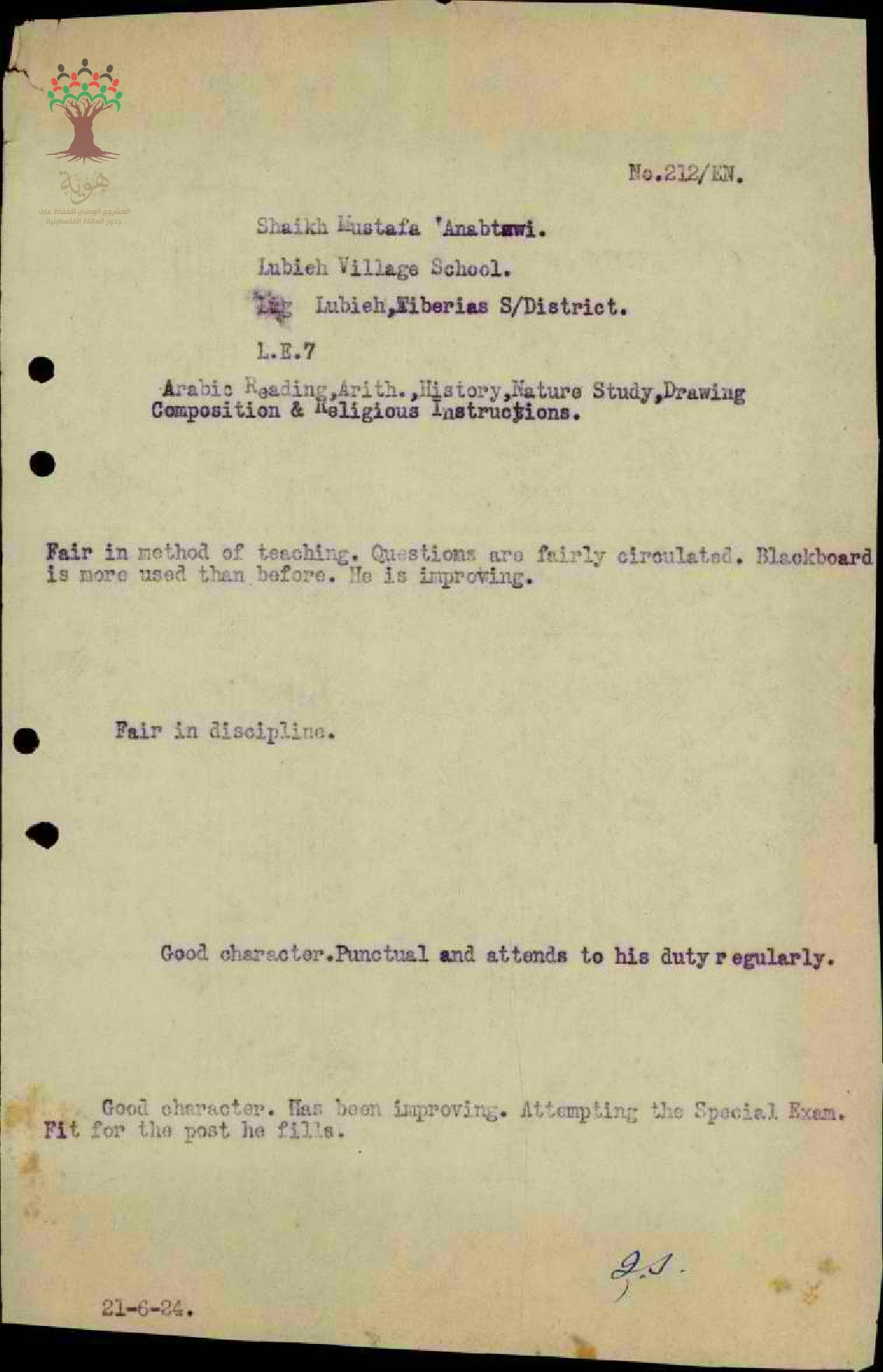تقرير عن أداء المعلم مصطفى عنبتاوي في مدرسة لوبيا سنة 1924
