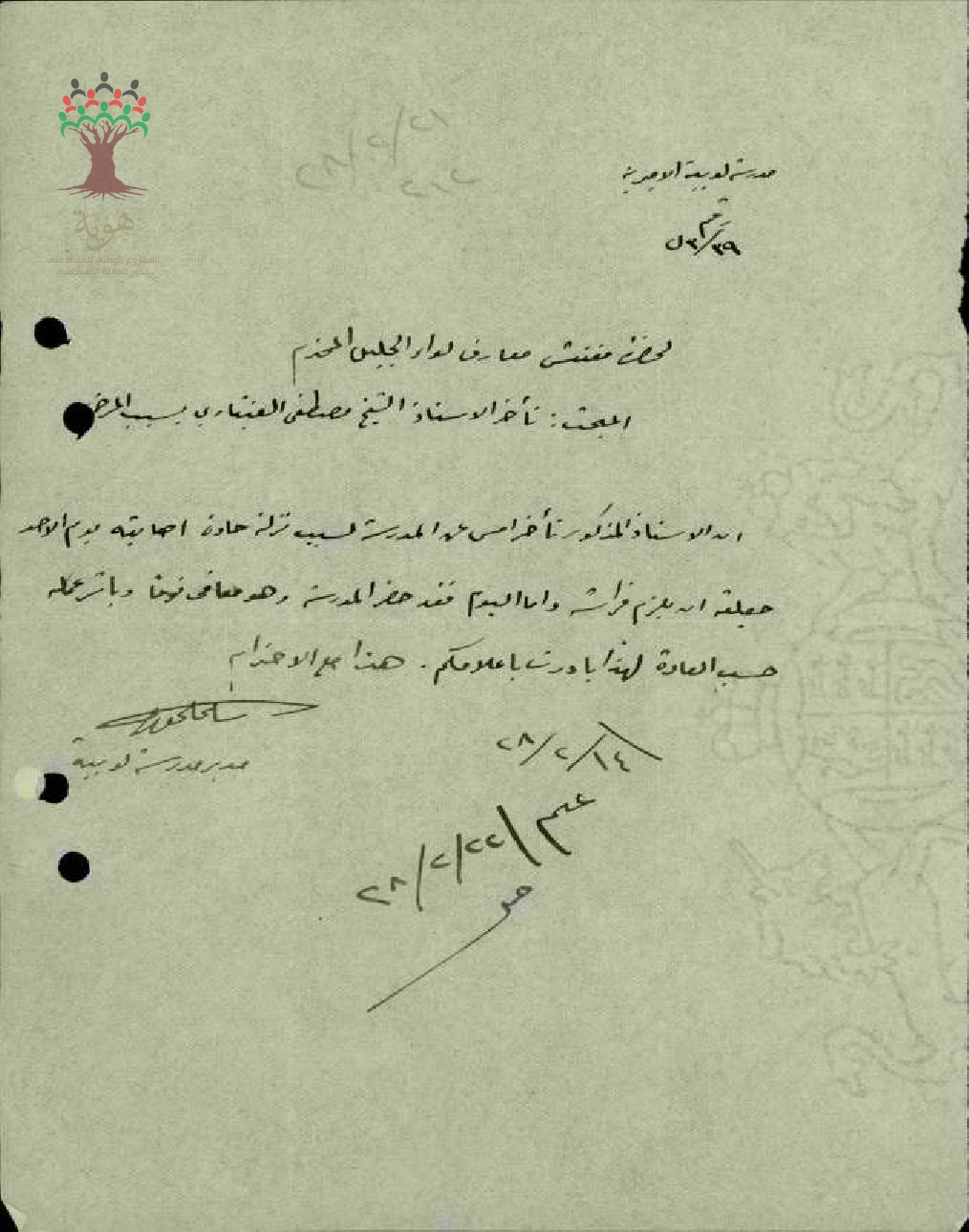 رسالة من مدير مدرسة لوبيا الى مفتش المعارف بخصوص تغيب المعلم مصطفى عنبتاوي وعودته الى العمل