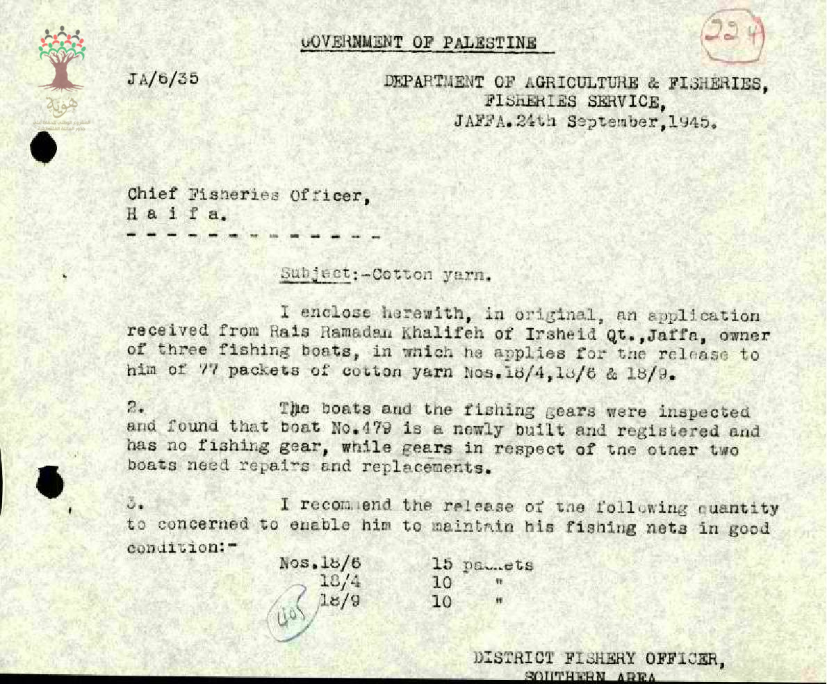 الريس رمضان خليفة يطلب من دائرة الصناعات الخفيفة كميات من غزل الصيد لمراكبه في يافا، ويحصل على توصية بذلك من مأمور المصايد في اللواء الجنوبي