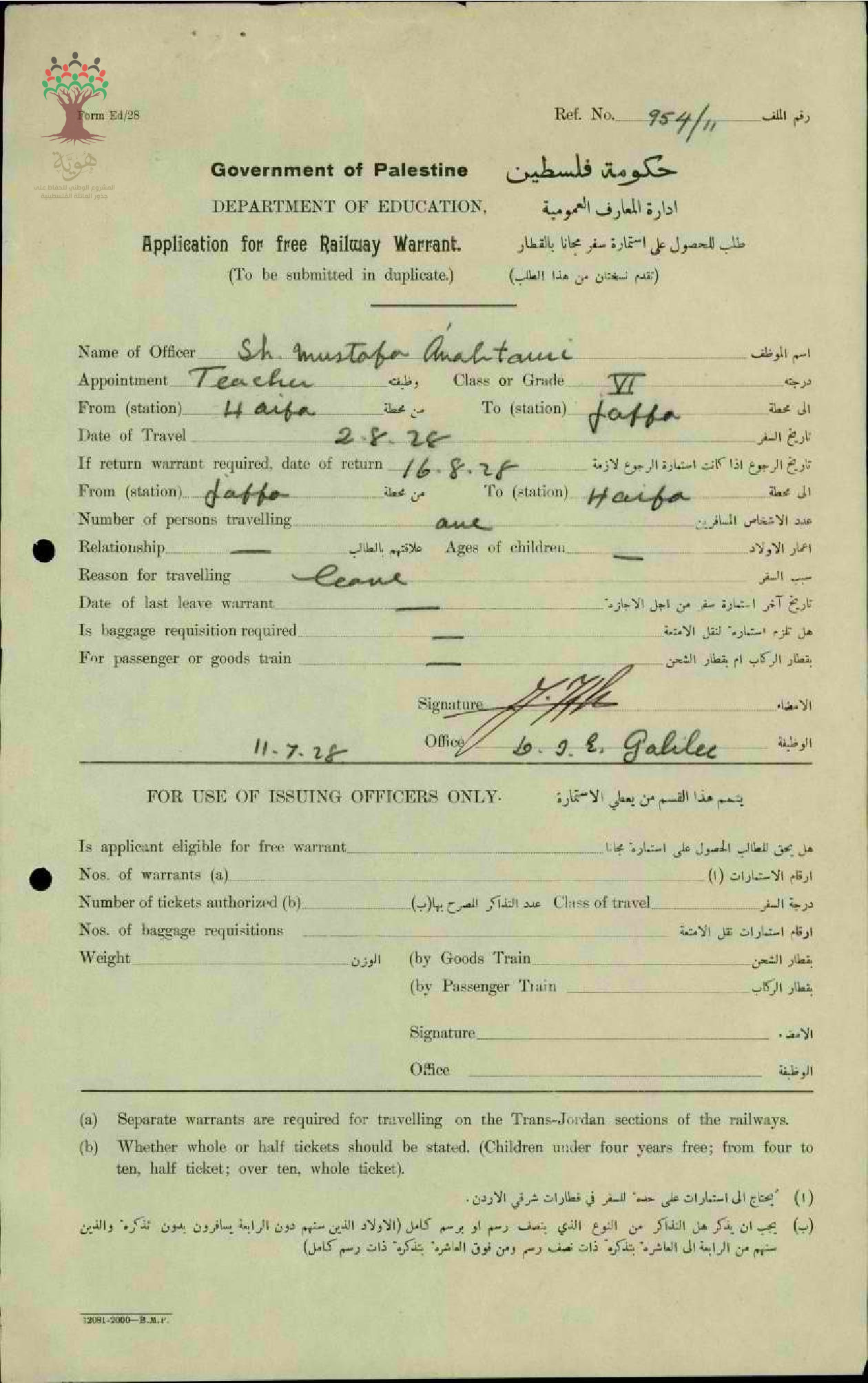 طلب استمارة سفر مقدمة من المعلم مصطفى عنبتاوي/لوبيا