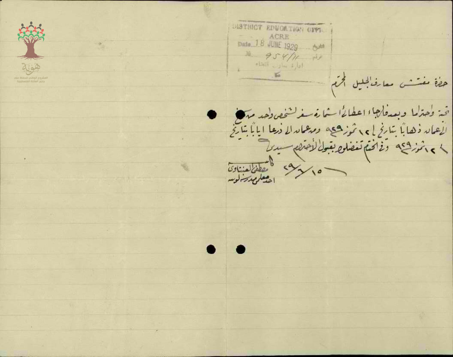 رسالة من المعلم مصطفى عنبتاوي الى مفتش المعارف يطلب فيها استمارة سفره السنوية