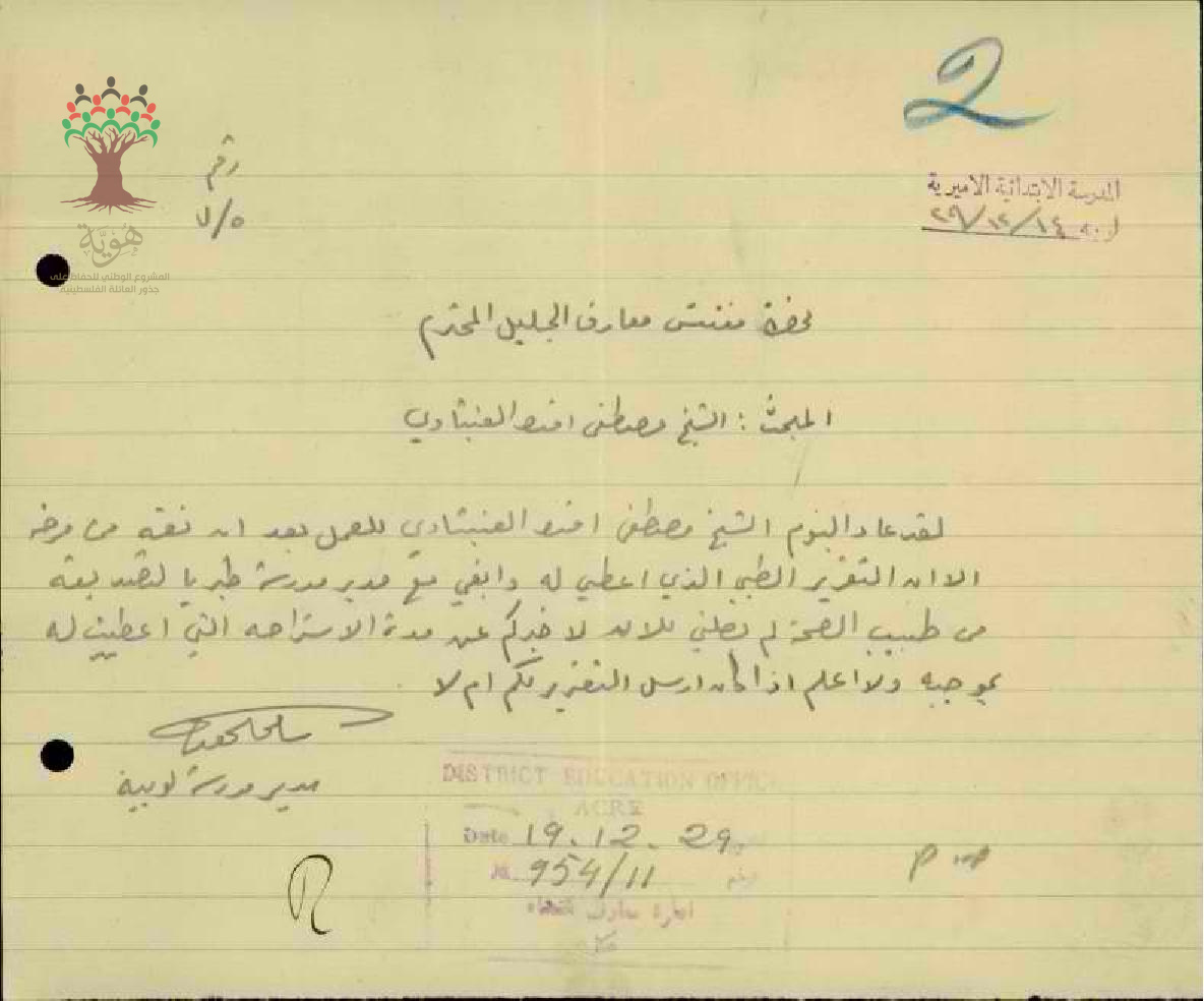 رسالة من مدير مدرسة لوبيا الى مفتش المعارف بخصوص عودة المعلم مصطفى عنبتاوي