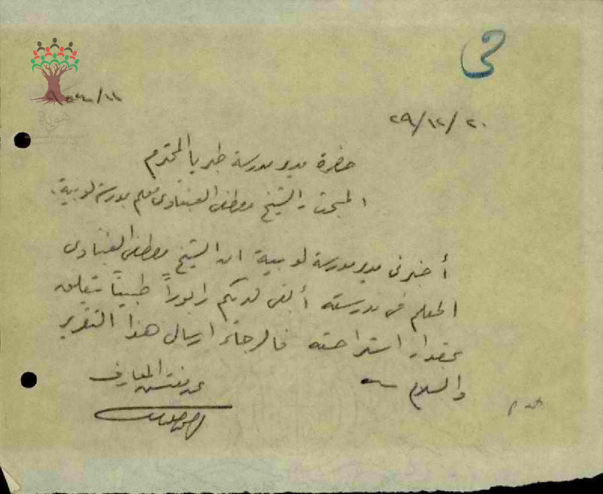 رسالة من مفتش المعارف الى مدير مدرسة طبريا يسأل عن التقرير الطبي لتغيب المعلم مصطفى عنبتاوي