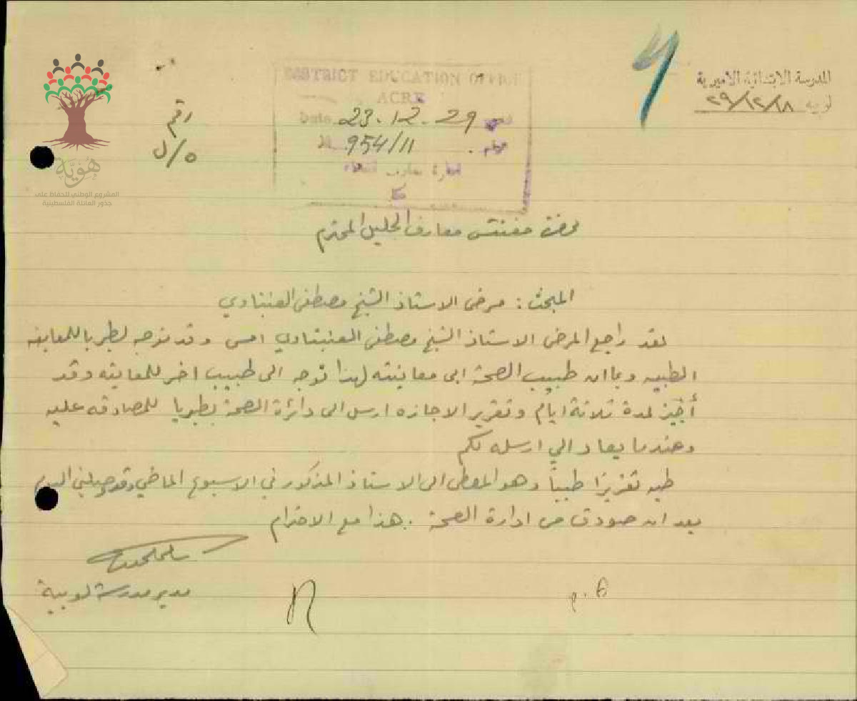 رسالة من مدير مدرسة لوبيا الى مفتش المعارف بخصوص تغيب المعلم مصطفى عنبتاوي مرفقة بالتقرير الطبي