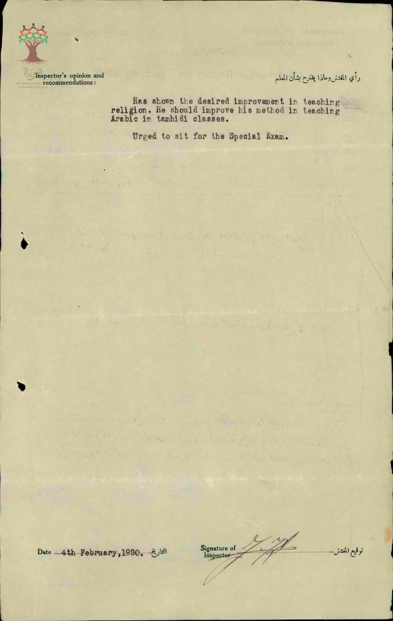 تقرير تفصيلي عن أداء المعلم مصطفى عنبتاوي في مدرسة لوبيا الابتدائية سنة 1929