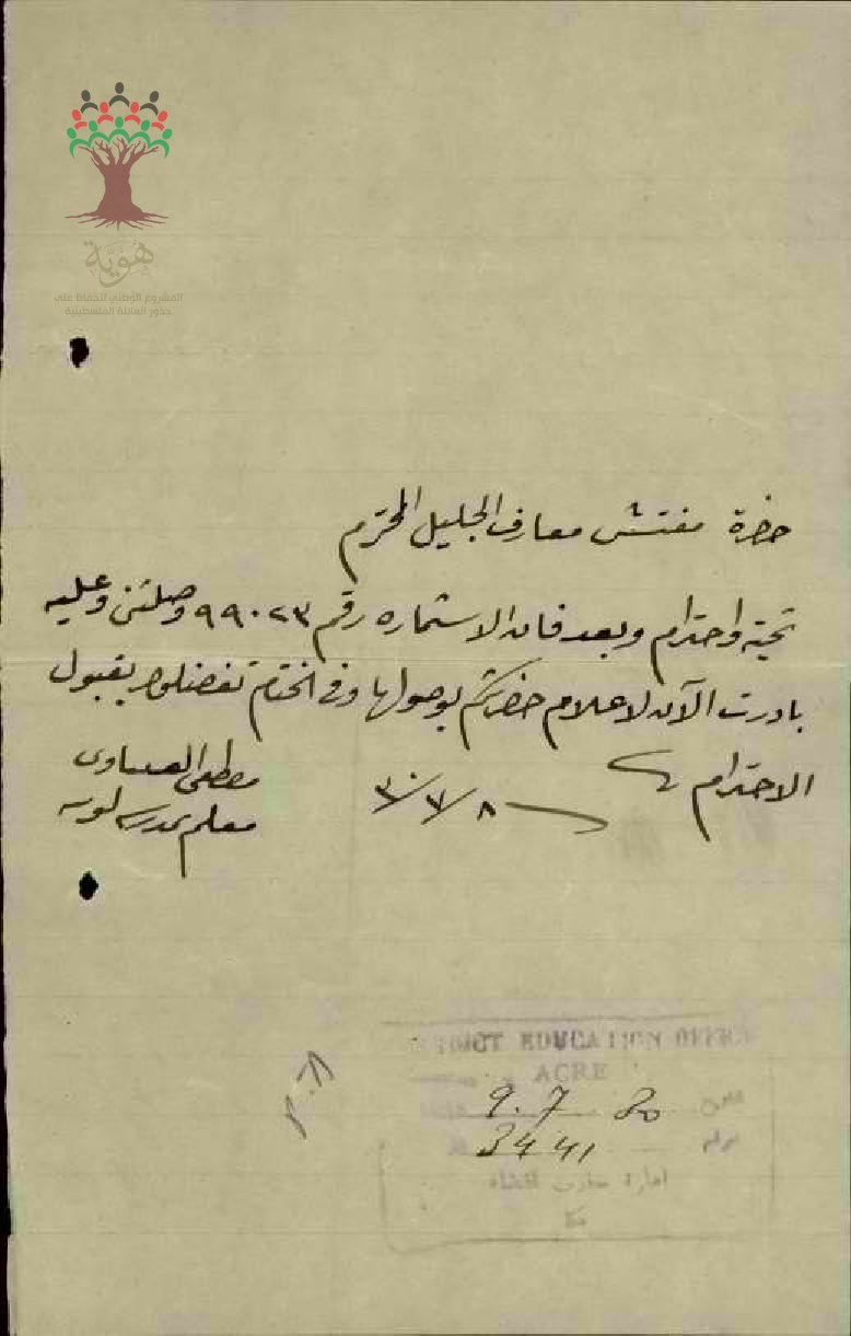 رسالة من المعلم مصطفى عنبتاوي الى مفتش المعارف يخبره بأنه قد استلم استمارة سفره