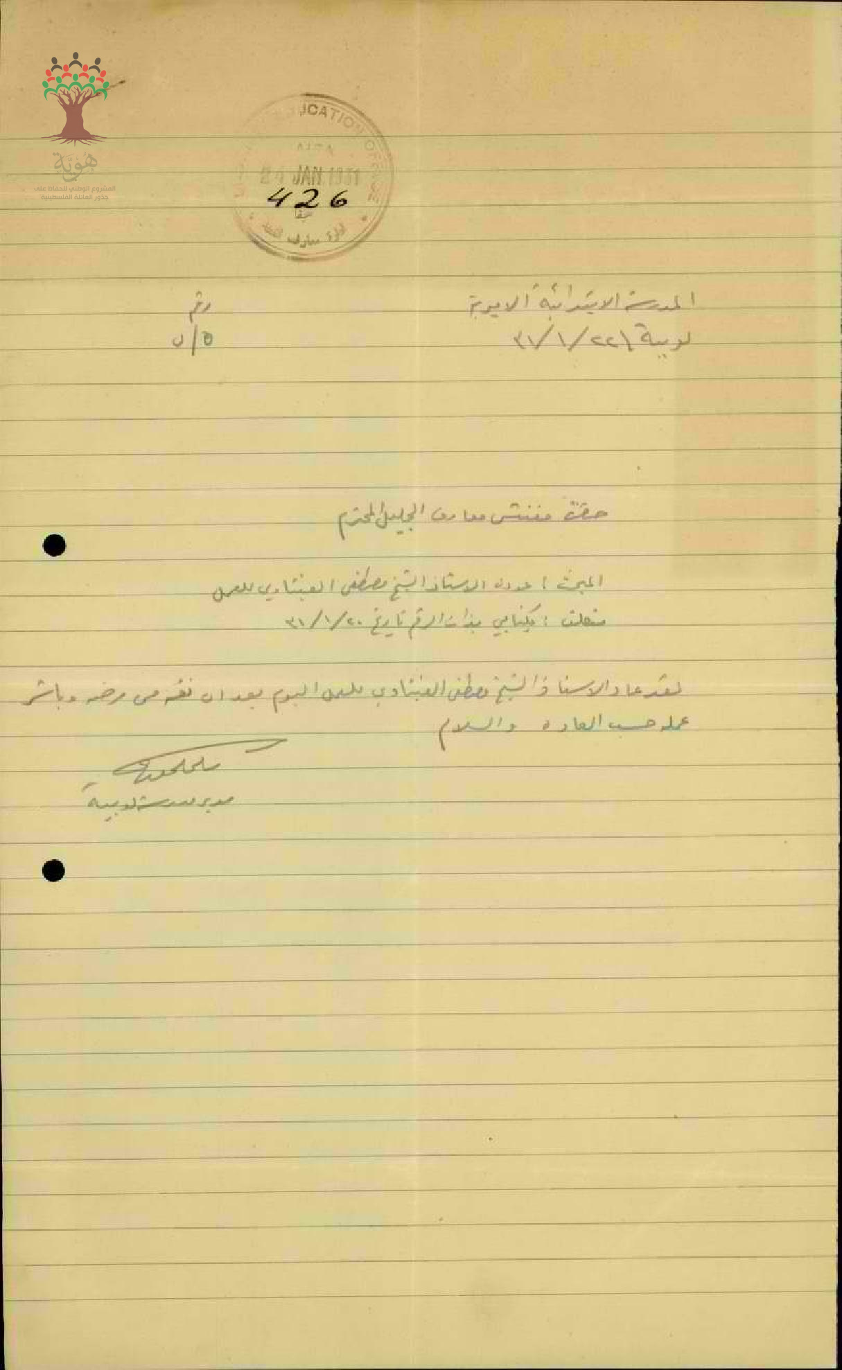 رسالة من مدير مدرسة لوبيا الى مفتش المعارف بخصوص عودة المعلم مصطفى عنبتاوي الى العمل