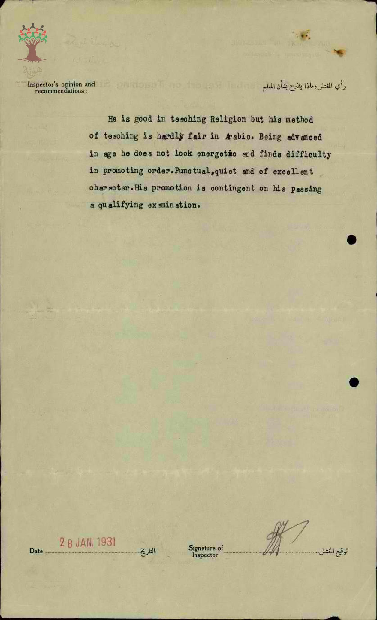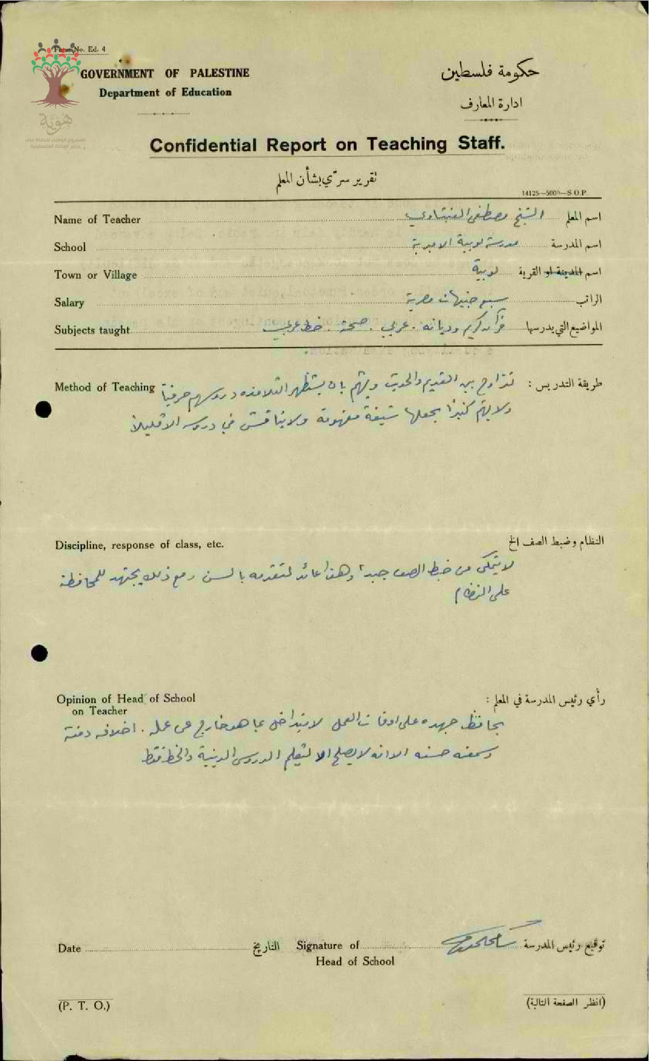 تقرير تفصيلي عن أداء المعلم مصطفى عنبتاوي في مدرسة لوبيا الابتدائية سنة 1930