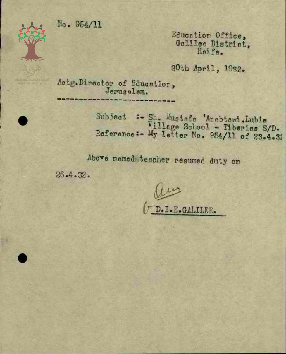 رسالة من مفتش المعارف الى مدير المعارف بخصوص عودة المعلم مصطفى عنبتاوي الى العمل