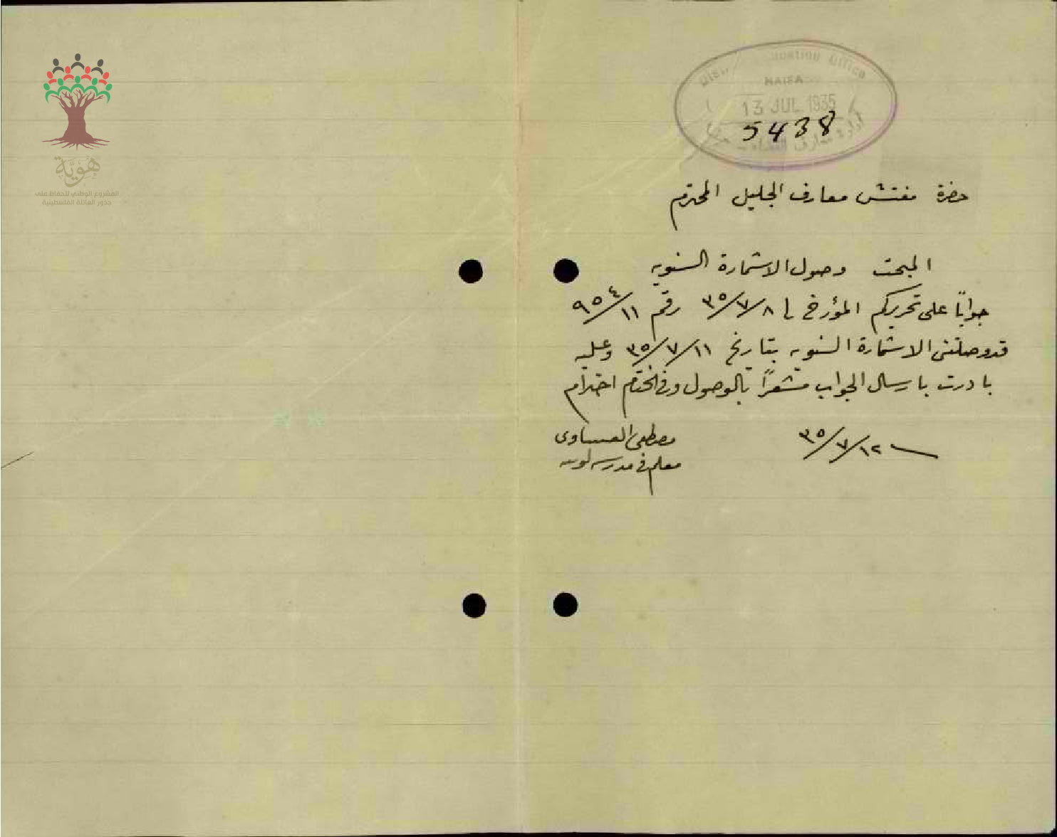 رسالة من المعلم مصطفى عنبتاوي الى مفتش المعارف يخبره بأنه قد استلم استمارة سفره