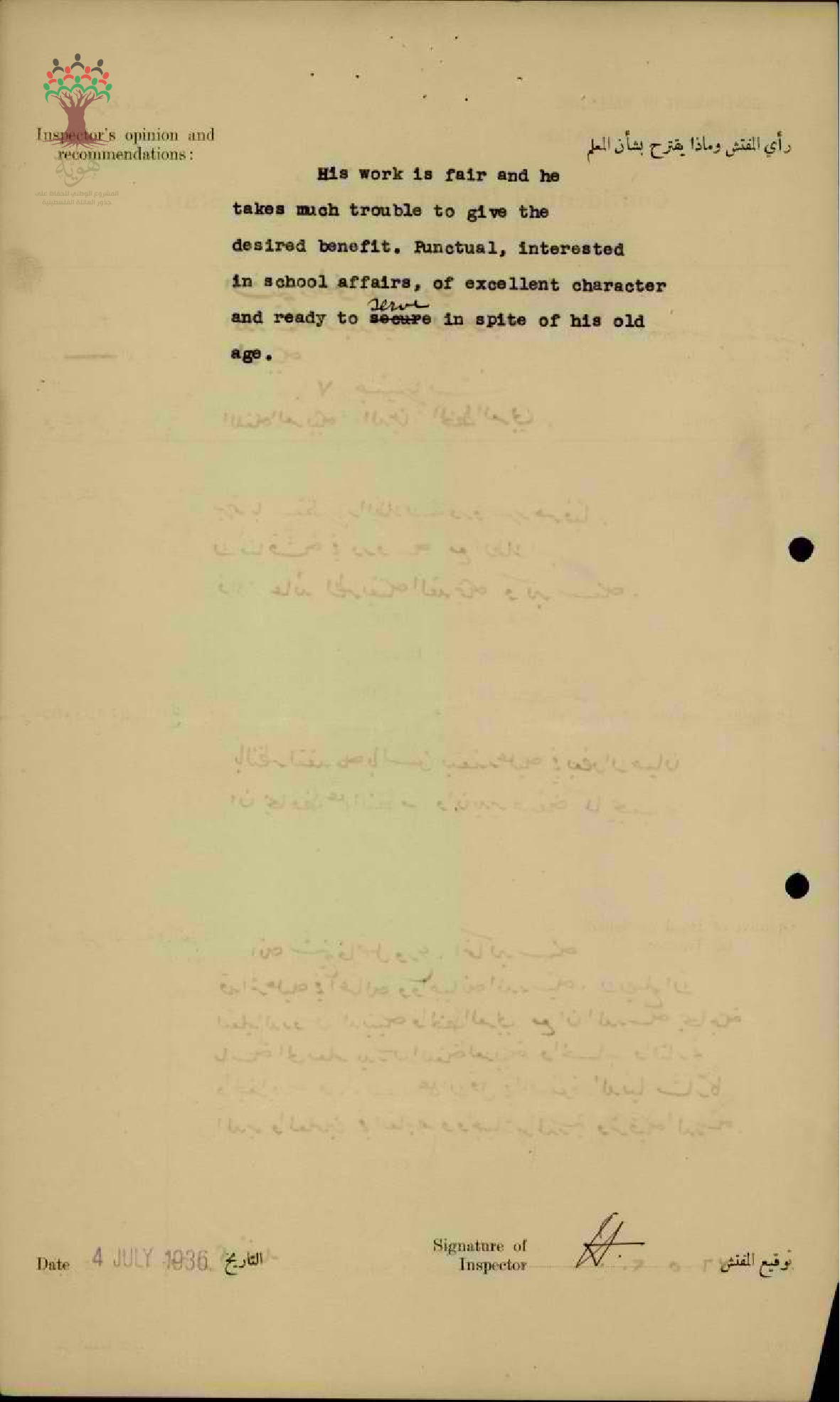 تقرير تفصيلي عن أداء المعلم مصطفى عنبتاوي في مدرسة لوبيا الابتدائية سنة 1936